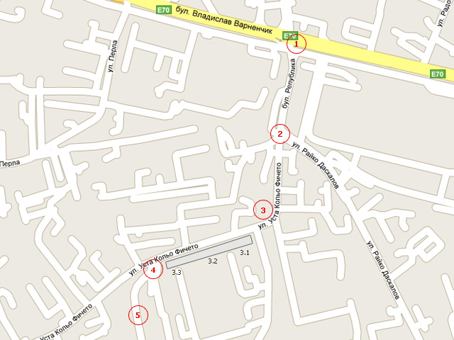 1. От булевард Владислав Варненчик, на кръстовището с бул. Република (Елдоминвест, Технополис, Пикадили-Практикер) завийте наляво в посока Западна Промишлена Зона (по бул. Република). 2. След 200 м. - на следващото кръстовище продължете направо, по пътя без предимство (ул. Уста Кольо Фичето). 3. След 200 м. пътят прави завой на приблизително 90 градуса надясно. Продължете по него. 4. В ляво остават сградите на Интерком груп (3.1) и Ай Ви Сейлингс (3.2). След сградата на GS Строймаркет (3.3) завийте наляво и влезте в двора на Агромашинаимпекс. 5. Входът е в средата на сградата. |
